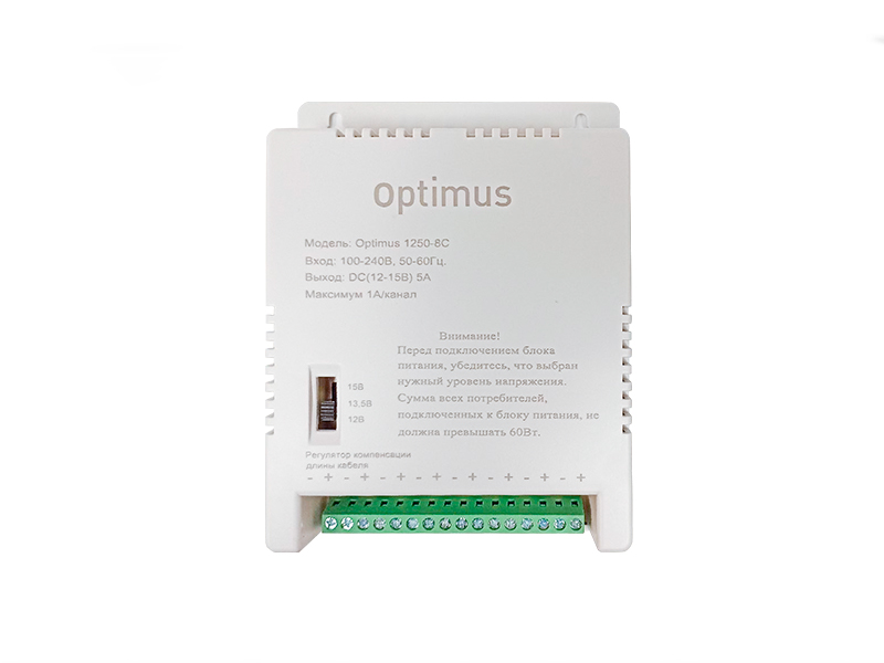 Блок питания Optimus 1250-8C предназначен для обеспечения электропитанием потребителей номинальным напряжением от 12В до15В постоянного тока и током потребления до 5А. Блок питания имеет переключатель режимов работы 12В, 13,5В 15В, предназначен для установки внутри помещения и рассчитан на круглосуточный режим работы. Представляет собой пластиковый корпус со степенью защиты IP54 (не является влагостойким, для уличного монтажа необходимо использовать специальную монтажную коробку). Напряжение питания от 100 В до 240 В, частота 50~60 Гц. 8 каналов, ток не более 1А на канал..
