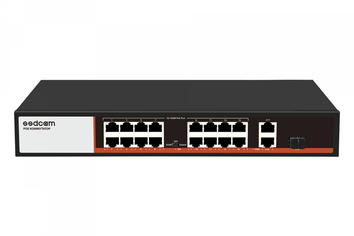 16 портов 10/100 Мбит/сек RJ-45 с поддержкой Auto-MDIX, PОE, + 2 порта 100/1000Mbps RJ-45 Uplink + 1 порт SFP, возможность установки в 19U стойку, на порт 48V Max.,15.4 Вт (IEEE 802.3af), общая мощность 300W, AC-220V (встроенный блок питания, 270x180x44 мм, вес 1550 гр. Усиление передачи данных до 250 метров, путем снижения пропускной способности до 10Мбит/сек на каждый РОЕ порт, кроме портов Uplink.