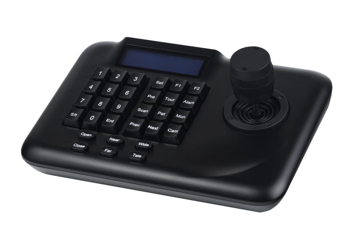 Универсальное устройство, предназначенное для использования в системах контроля безопасности, с помощью которого осуществляется дистанционное управление камерами. Клавиатура имеет 3D-джойстик, что позволяет управлять камерами, уменьшать или увеличивать зум. Клавиатура также оснащена ЖК-дисплеем с функцией подсветки. На дисплее отображается текущий порядок работы, протокол управления, текущий ID-номер камеры и положение джойстика. Джойстик и ЖК-дисплей облегчают процесс управления системой видеонаблюдения.